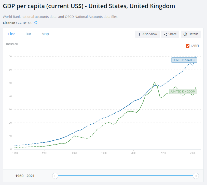 Some of this divergence is due to the strength of the dollar against the pound since 2008, and the PPP measure does not tell such a drastic story. However the same trend can be seen in comparison with the rest of the Anglosphere: while Britain was richer than Canada, Australia and New Zealand in the decade up to 2007, it is now poorer than them all, and has also been overtaken by Israel and Singapore in the same time period. As Britain falls further behind its erstwhile peer countries, it will find it increasingly difficult to attract highly skilled immigrants who will be concerned with their living standards and the value of their remittances, and who have many other options to choose from.