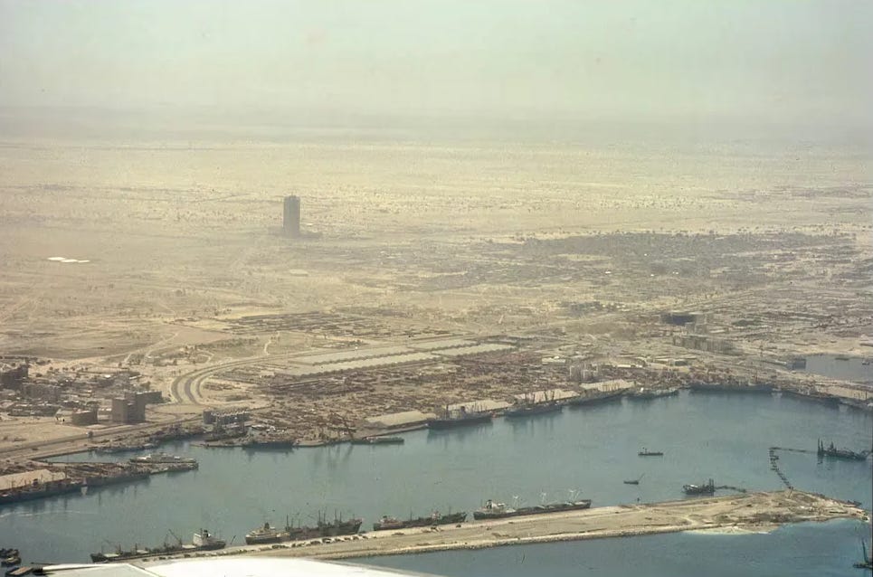 Dubai then started to come into its oil wealth (though far less than its neighbours), which was invested in more infrastructure. The next project was a new port, Port Rashid, completed in 1972 and at Sheikh Rashid’s urging, far larger than there was demand for at that time (Krane, City of Gold: The Gambler). The Dubai Dry Docks came later in the decade, against much advice that it was folly, as among other reasons, Bahrain was also building dry docks for which it had much more backing. Then came a gigantic aluminium smelter and desalination plant, and then the Sheikh Rashid tower. Nowadays this looks pretty unimpressive (it resembles London’s Centre Point) but at the time it was the tallest building in the Middle East, and was built standing alone in a desolate desertscape.