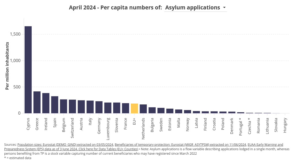 This is clearly not the zero asylum seekers of Frederiksen’s claim, and in fact as a proportion of Denmark’s population of 5.9 million was not that different from Britain, where asylum claims were about 40,000 a year from 2015 until 2020 (though much more in recent years). It is low for Europe though: as of April 2024 Denmark had one of the smallest per capita rates in the EU, and the smallest in Western Europe (I am cleaving to Portugal’s spiritual identity here as belonging to Eastern Europe).