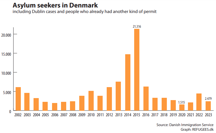 2019 was the year of the Danish ‘paradigm shift’ where the focus of policy shifted from integration to return to countries of origin. That year Prime Minister Mette Frederiksen stated that her government’s goal was ‘zero asylum seekers’ (referring to people arriving via irregular channels: Denmark still accepts an annual quota of 200 of the most vulnerable asylum seekers from the UNHCR). Since 2015 numbers have dropped to less than 5,000 per year, with around a quarter of these being ‘remote registrations’ who already had a residence permit to stay in Denmark.