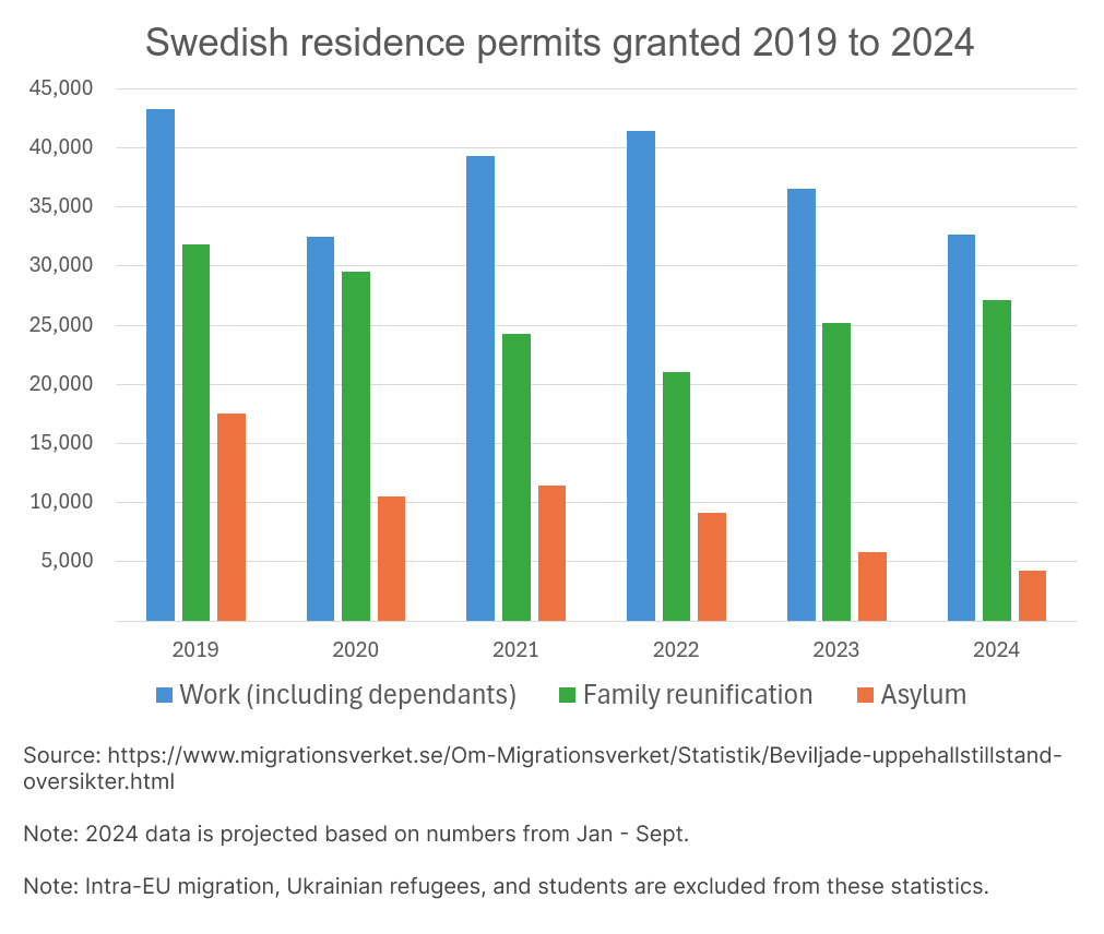 Non-EU labour migration also has not significantly decreased. Though unlike in many other countries recently, e.g. Britain’s post-Covid ‘Boris-wave’ of low paid care worker migration (and their dependants), it has not increased either. Looking into the details of who gets these visas, the majority of permits here are for agricultural workers (which are presumably temporary) or for various categories of engineer. There seems to be little low paid long term labour migration. Overall, to take 2023 as an example, in Sweden there 36,514 work and dependant visas granted. In Britain there were 616,371 such visas granted, nearly three times as many as a proportion of the population, and largely as a result of the massive expansion in care worker visas.