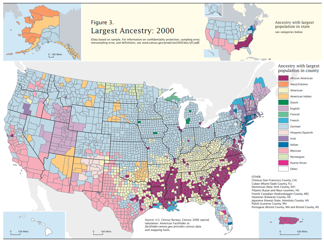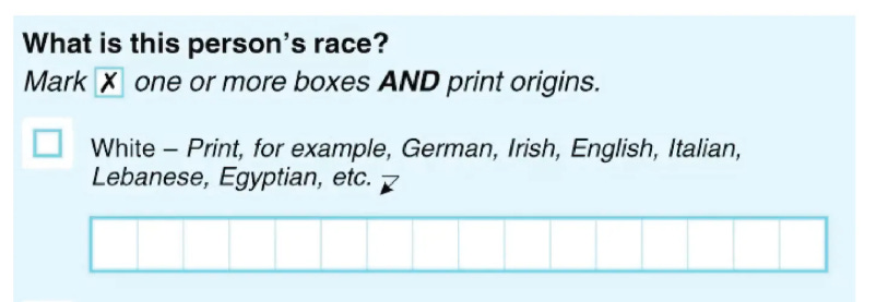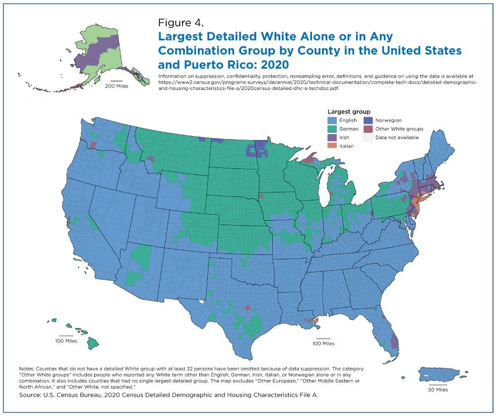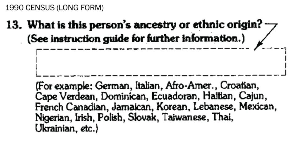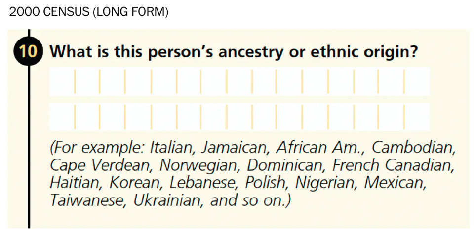 Since 2000 the ancestry question has been dropped from the census and transferred to the ACS. However from 2020 both the census and the ACS changed the ‘race’ question, which had previously not allowed any more detail than ‘white’, to include a write-in box for racial ancestry, with the top three example white ancestries being German, Irish and English.