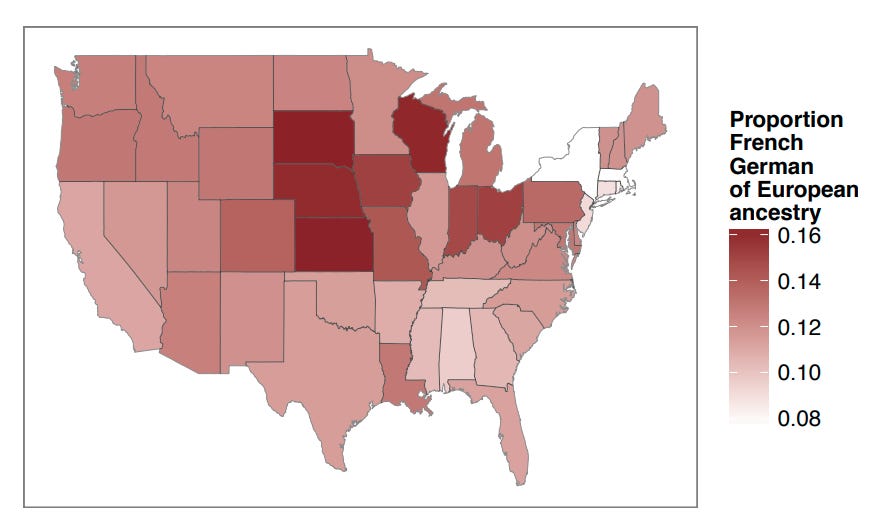The only study I’m aware of that does shed more light on the question is the 2015 paper The Genetic Ancestry of African Americans, Latinos, and European Americans across the United States, based on 23andMe data. 23andMe breaks down ancestry into categories including ‘British / Irish’ and ‘French / German’, which is not ideal for isolating British specifically, but is still more useful than other papers I’ve found. Figure S10 in the paper shows the relative proportions of different European ancestries per state, from which we can see that the British/Irish proportion (25% to 40% for most states) is multiple times greater than the French/German one (8% to 16%).