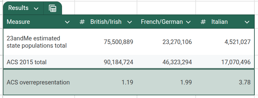 What is useful is the relative difference between groups. While British/Irish ancestry is 1.2x more prevalent in the ACS than in the genetic data, French/German ancestry is 2x more prevalent, and Italian ancestry is 3.8x as prevalent. I will assume that it is British, rather than Irish, ancestry which is undercounted in the ACS, due to it being a less salient and desirable one. Going by this data then, the census/ACS proportions of only 1.5x British vs the next highest ancestry of German is a significant undercount, and there are likely tens of millions more Americans of British ancestry than show up in the census or ACS data.5