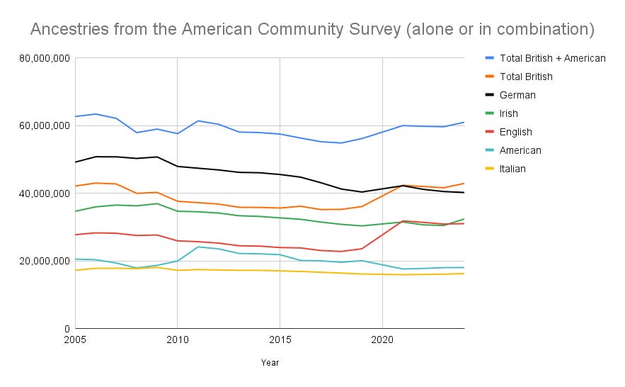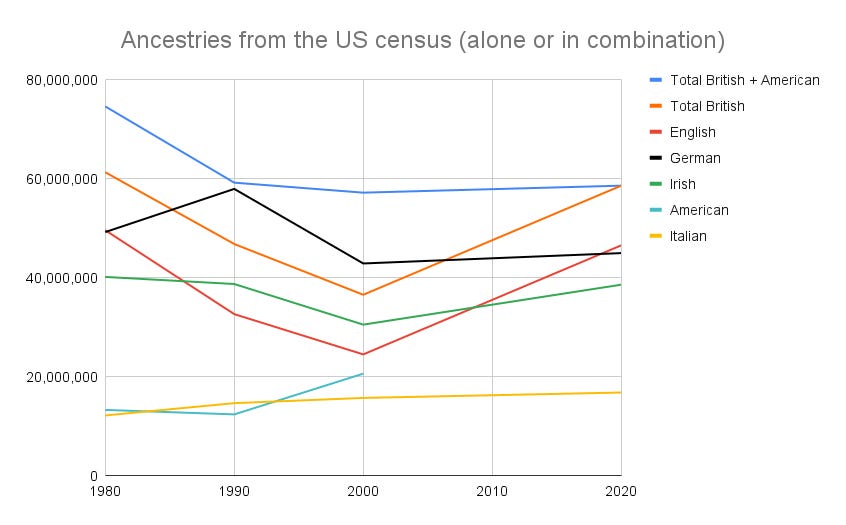 This chart shows ancestries (alone or in combination) from the US census in 19803, 1990, 2000 and 20204. In addition to the original figures, I’ve added all the British ancestries (English, British, Scots-Irish, Scottish, Welsh) together into a ‘Total British’ category, and then added ‘American’ to this to make a ‘Total British and American’ category. (Those who put their ancestry as ‘American’ tend to be of British ancestry). Raw data is here.